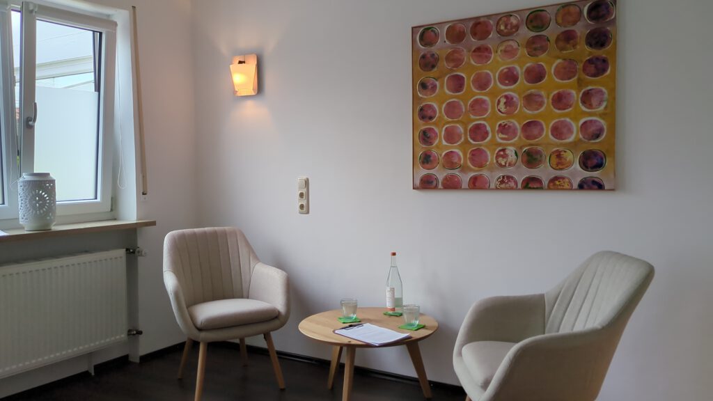 Mein Praxisraum ist bewusst schlicht und klar gestaltet – frei von Ablenkung, damit Sie Ruhe finden und sich ganz auf Ihre persönliche Entwicklung konzentrieren können. Die behagliche Atmosphäre lädt zum Ankommen ein und schafft eine vertrauensvolle Basis für unsere gemeinsame Arbeit.